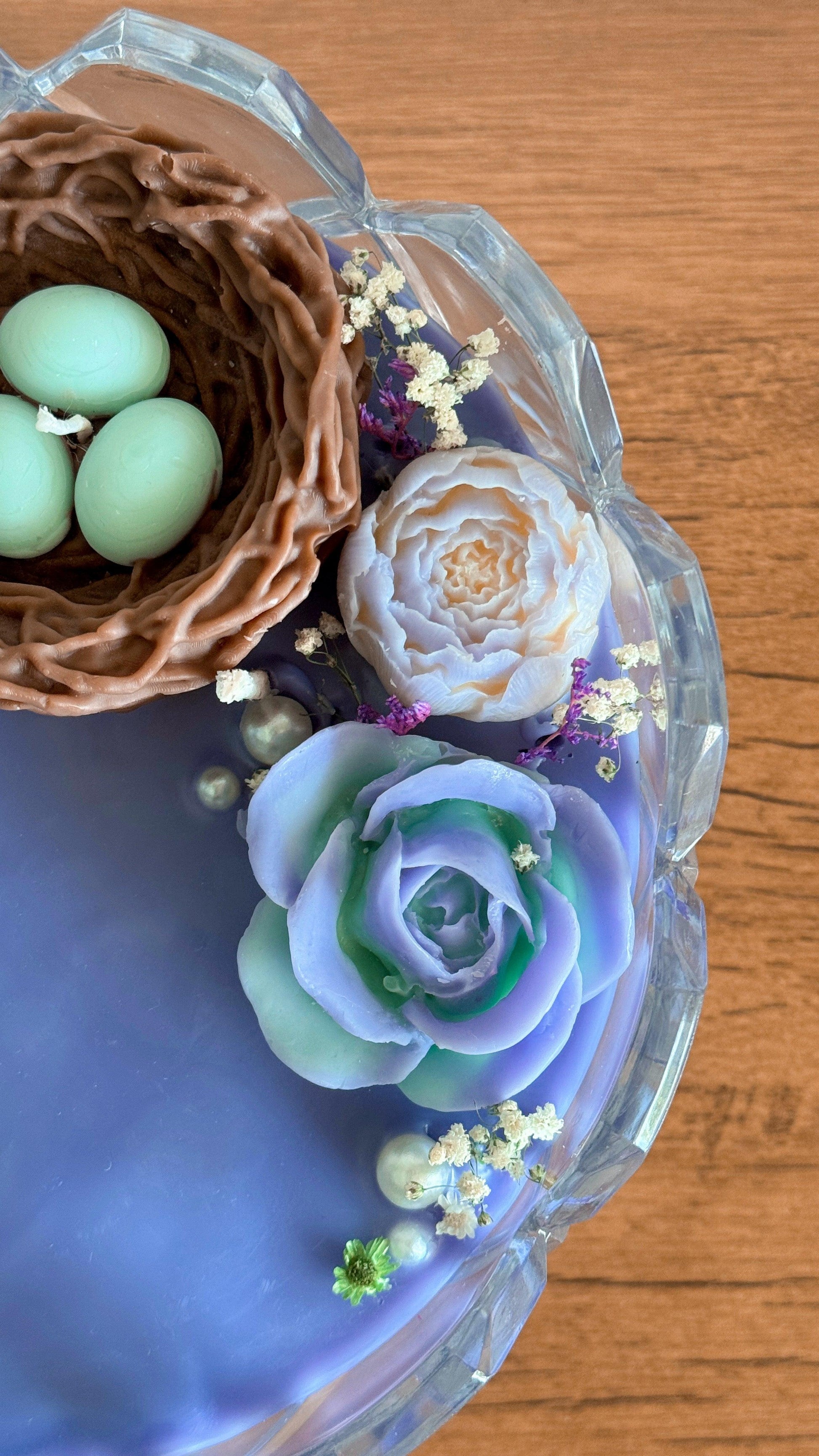 Quite possibly the best spring candle for your home decor collection, this design offers a little bit of everything! Our spring candle collection offers an array of pastels and tie-dye colors that make the designs both whimsical and bright. This vessel offers both wax flowers and dried baby's breath, a nestled wax bird's nest, pearls, and stands on 3 curled glass feet. Scented with "Magnolia + Peony" which offers hints of lilac and jasmine that crest into top notes of lush green leaves and sugared peach. A dusting of powder, woodsy vetiver and sandalwood, and sensuous light musk provide depth and dimension.Â