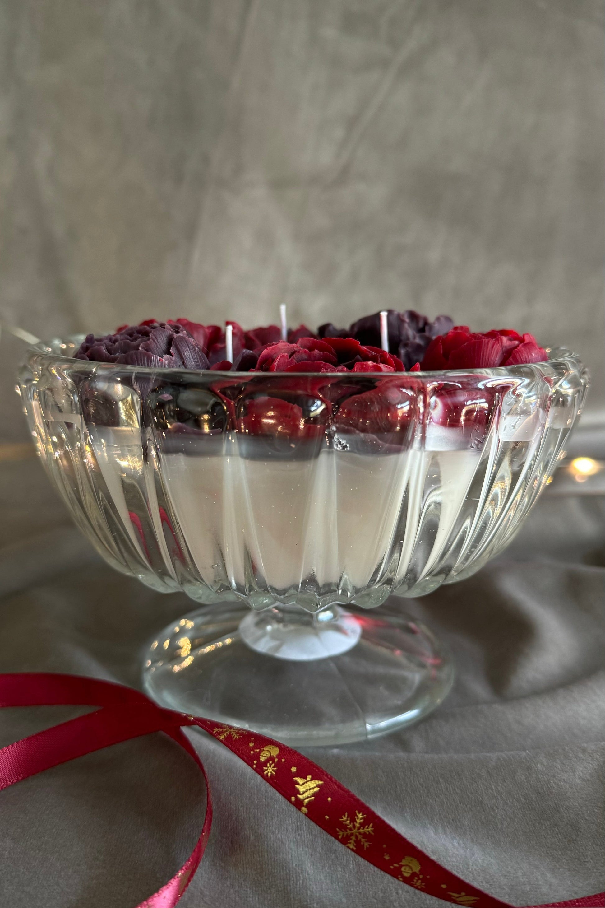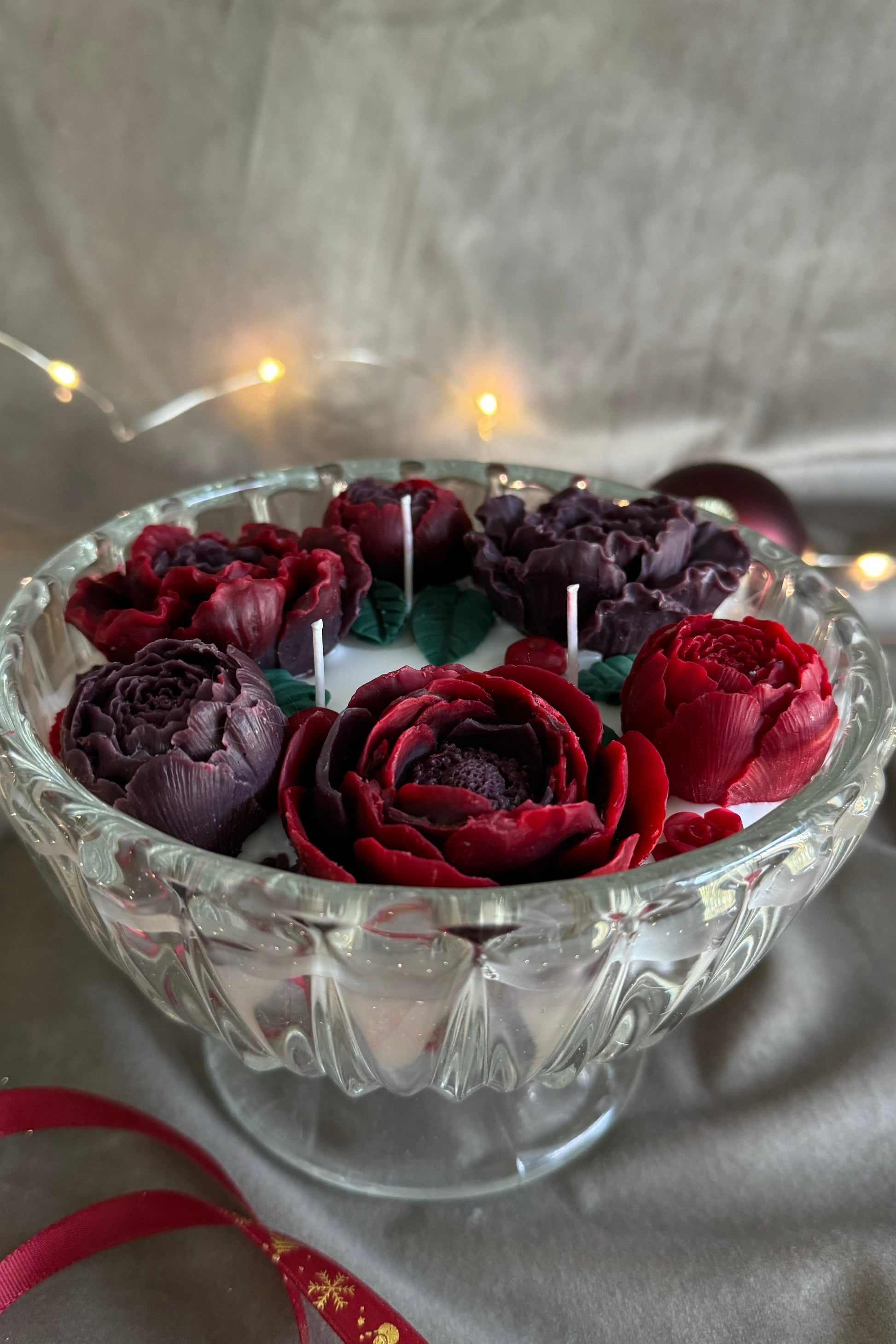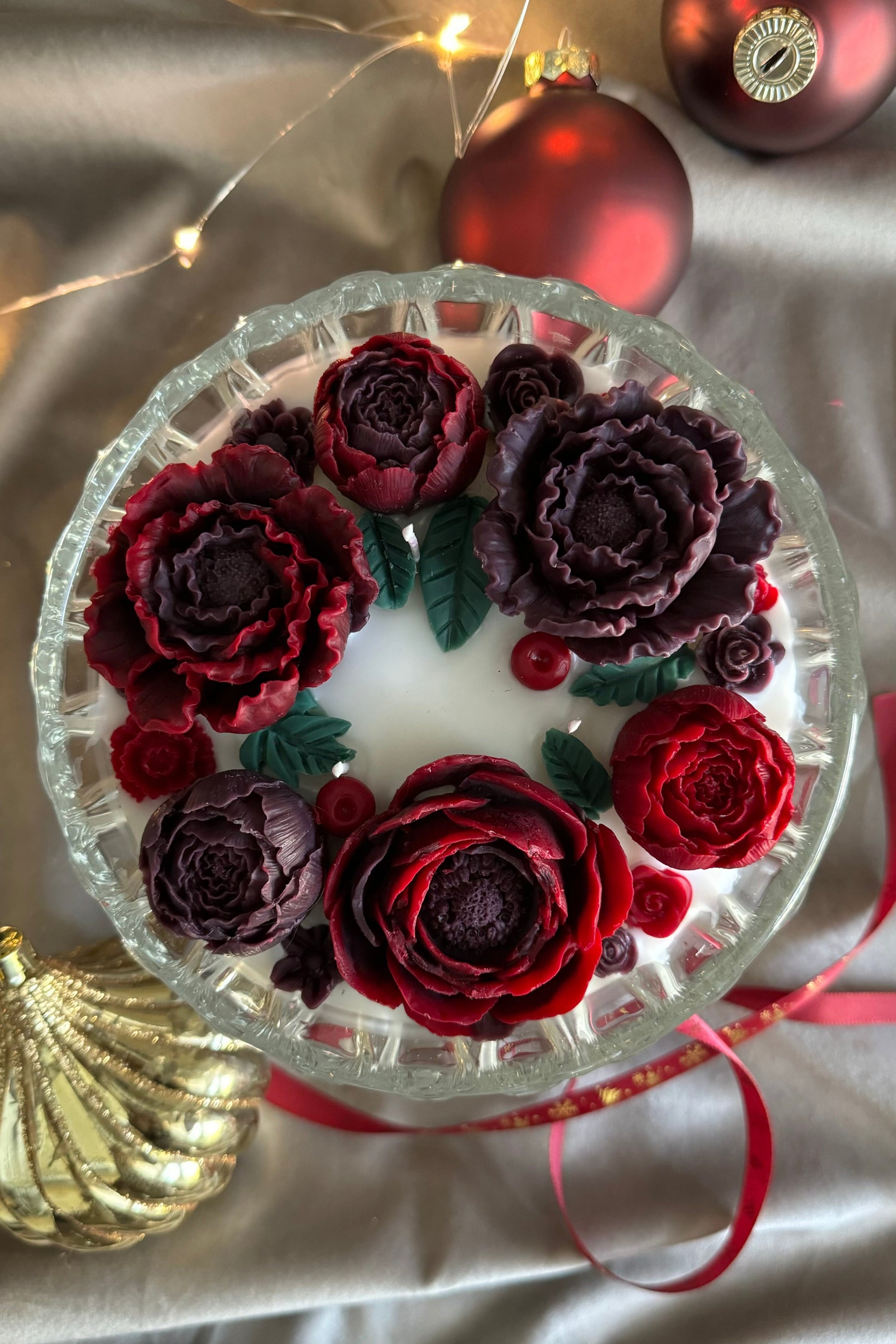 Indulge in the festive spirit with this stunning center piece, featuring the rich, comforting aroma of peppermint mocha fragrance oil. Hand-poured and adorned with stunning crimson and deep violet wax flowers, this elegant holiday candle is perfect for gifting or elevating your Christmas décor. And as always, our candles are poured in a thrifted vessel! Create a cozy, inviting atmosphere with this peppermint-scented candle, designed to make your holidays unforgettable.
