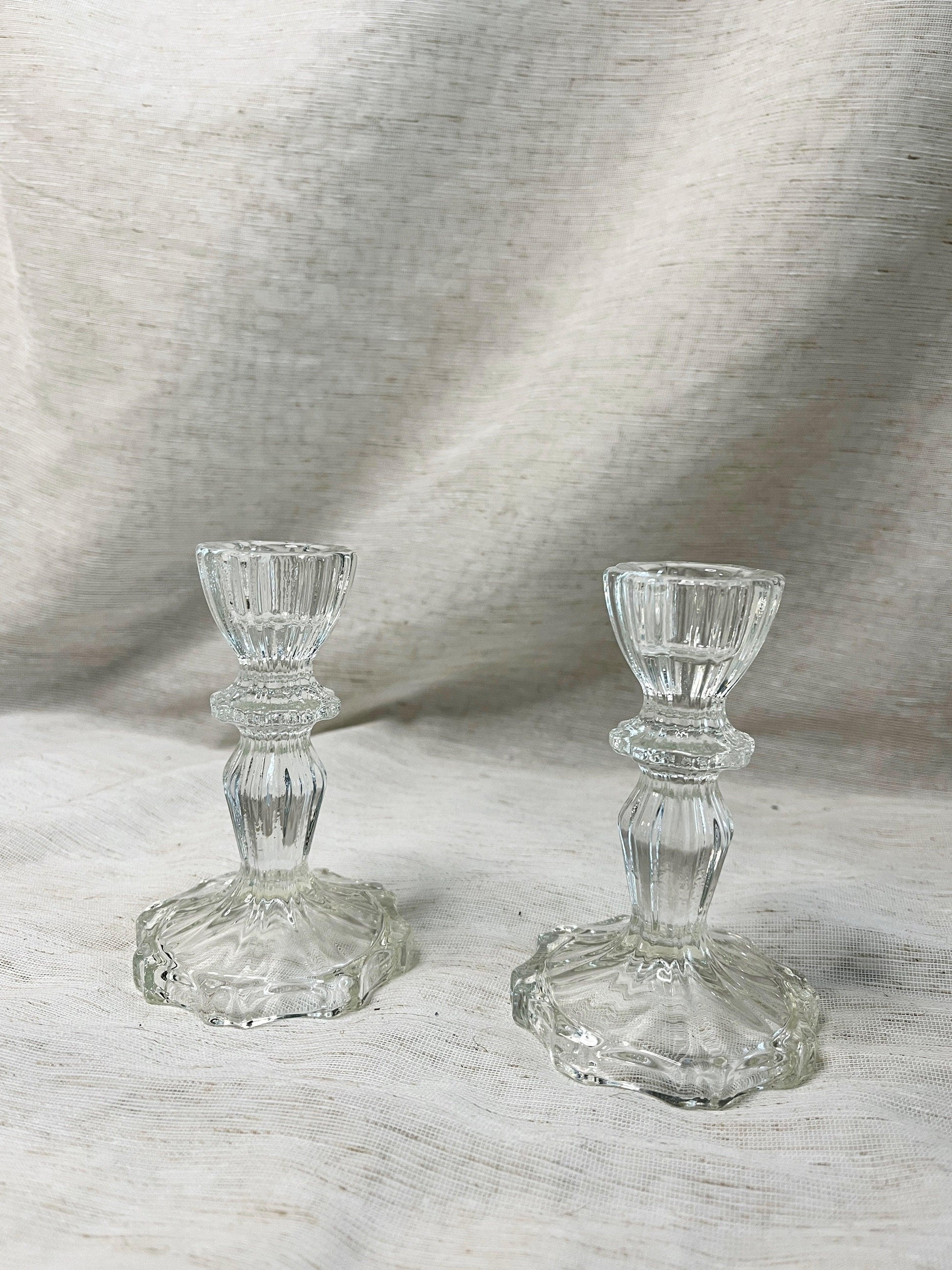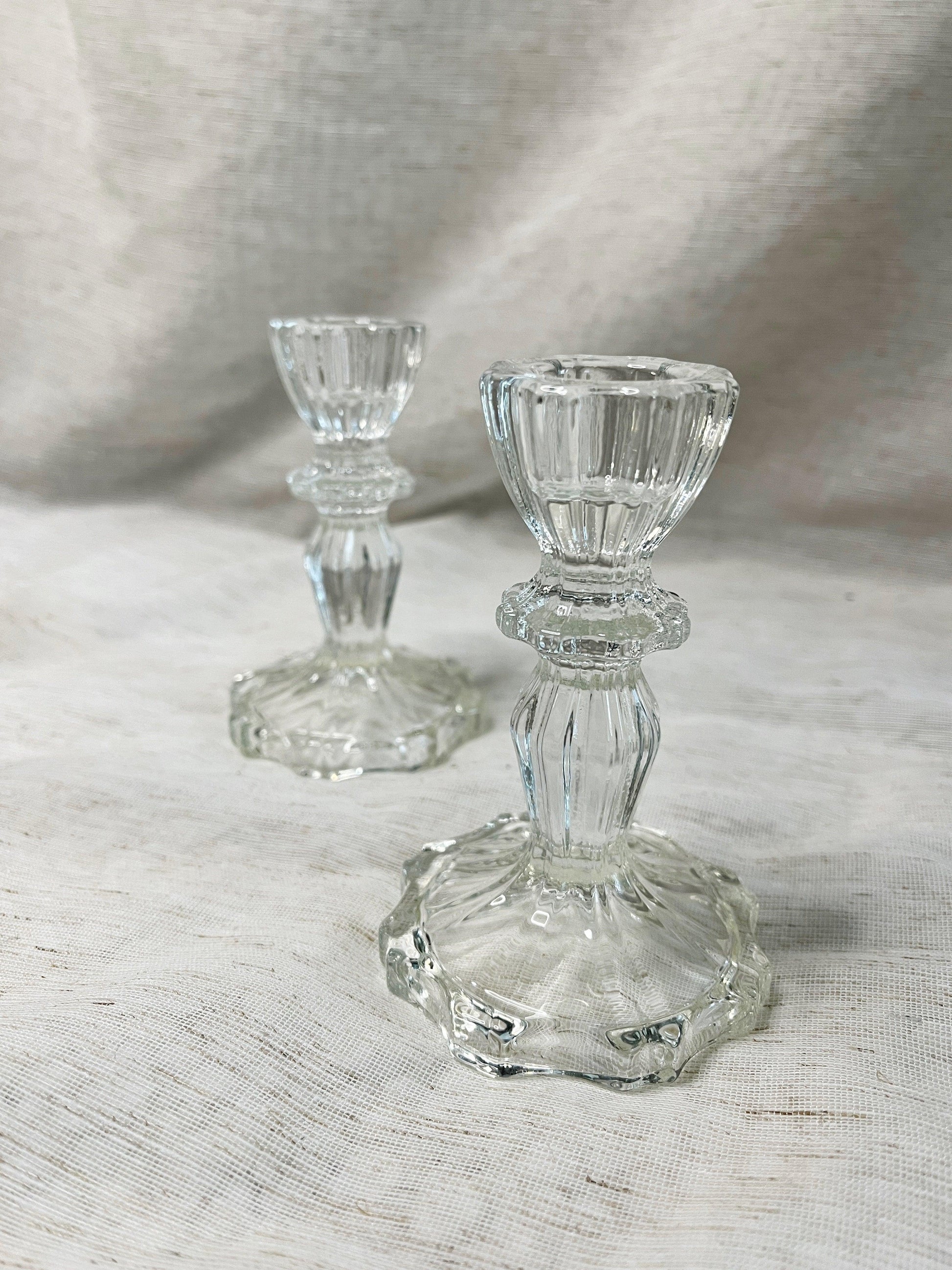 Medium height pair of detailed glass candle holders. They work well with more intricate or modern candle holders as a set. Pair them with our other designs with alternate heights for an interesting tablescape. Dimension 4.5"H x 3"D