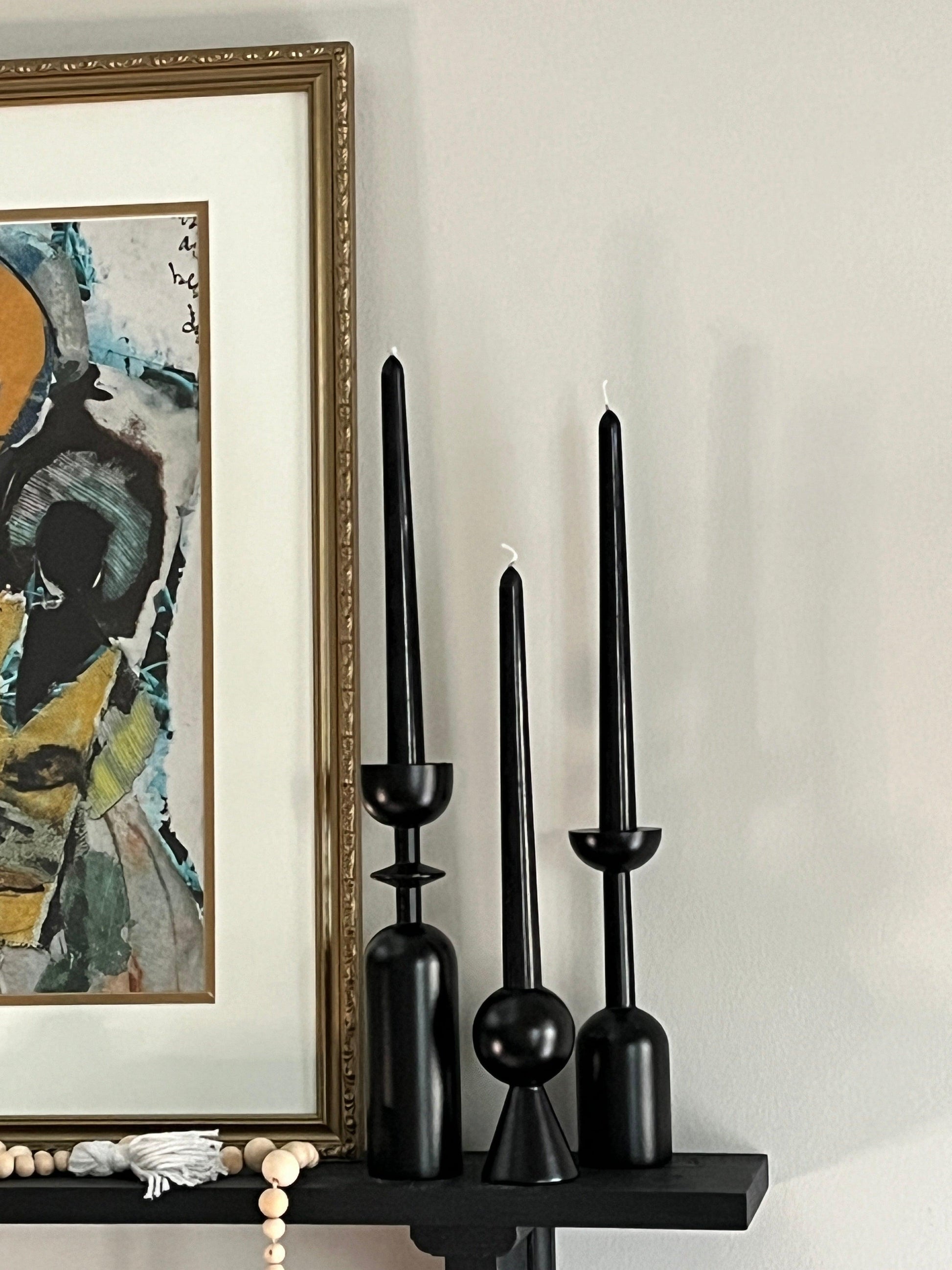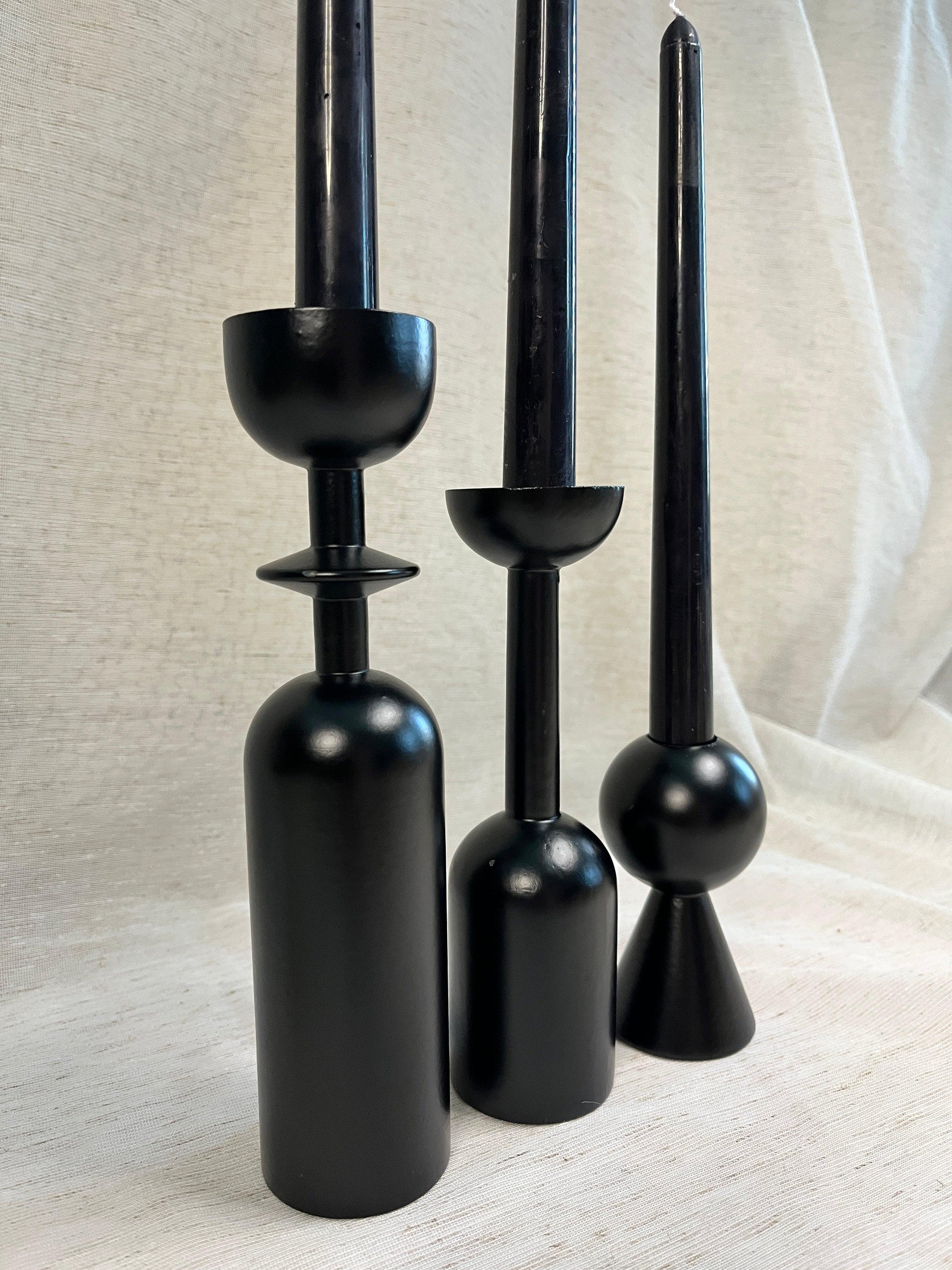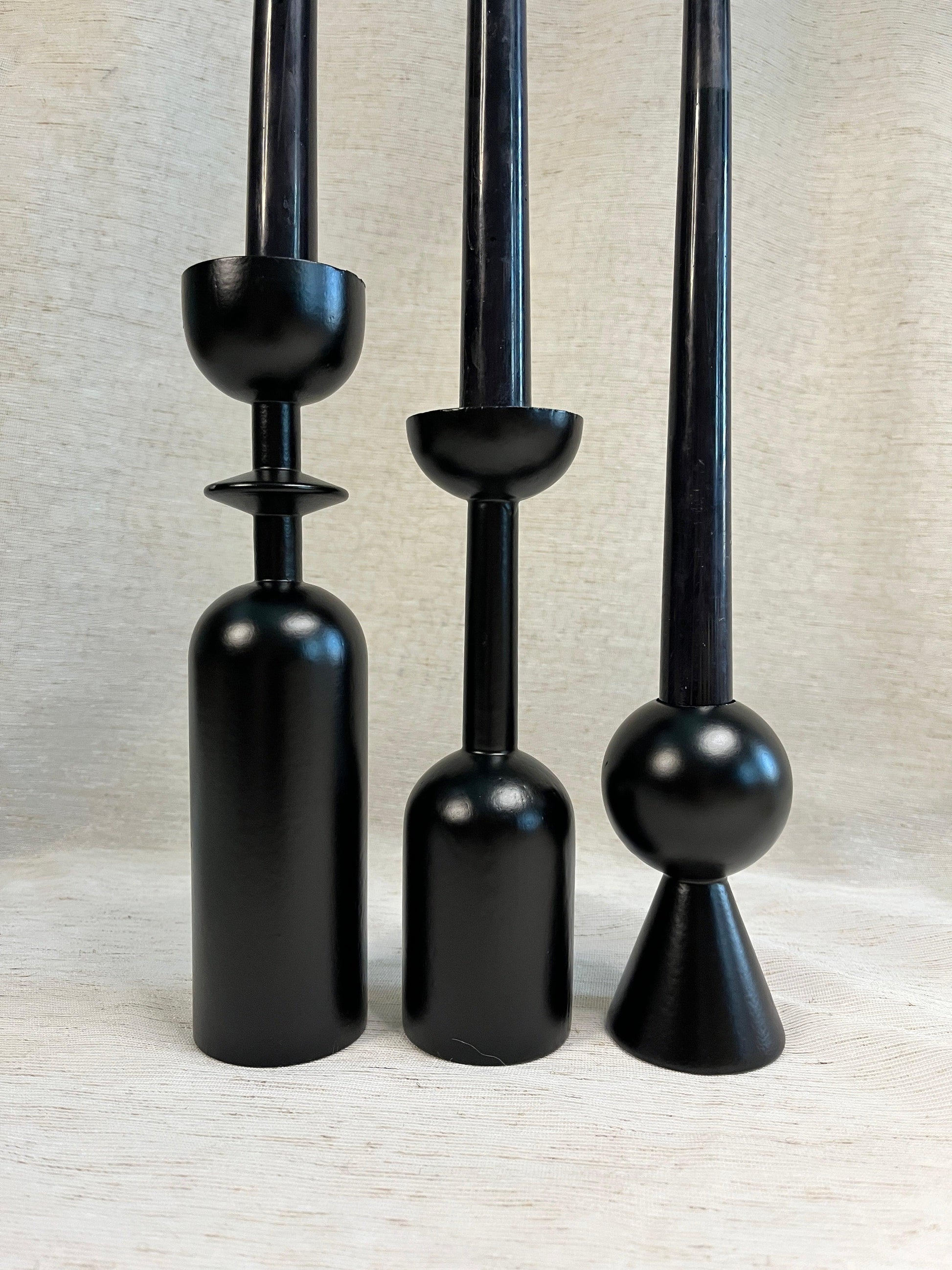 These simple, modern candlestick holders are great as a set or placed individually around your home. Sizes from short to tall are 4"H, 7.25"H and 9"H. Bases are all 2"D.